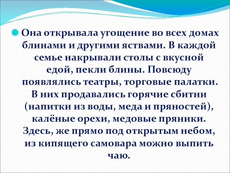 Слайд 12Она открывала угощение во всех домах блинами и другими яствами. В
