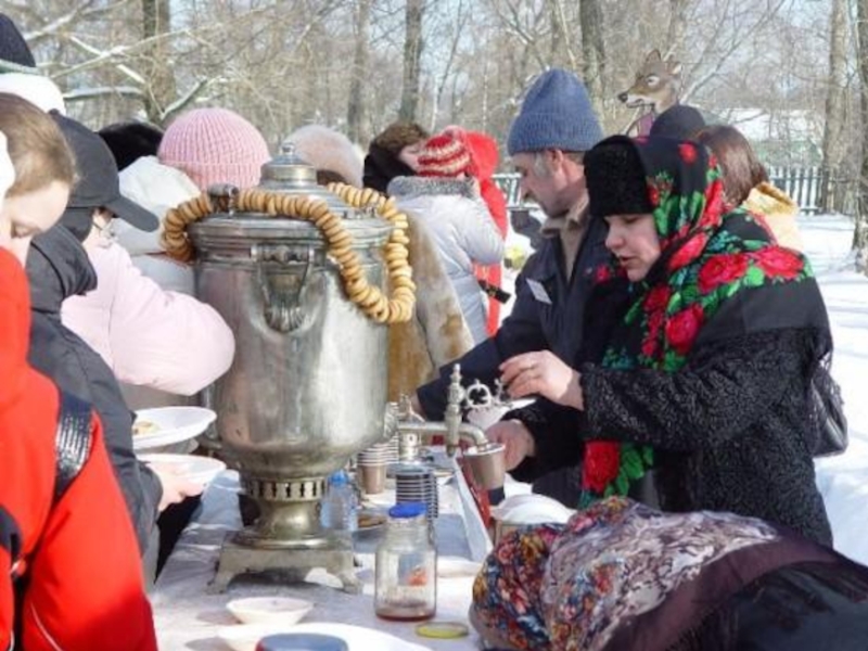 каждой семье накрывали столы с вкусной едой, пекли блины. Повсюду появлялись театры, торговые палатки. В них продавались горячие сбитни (напитки из воды, меда и пряностей), калёные орехи, медовые пряники. Здесь, же прямо под открытым небом, из кипящего самовара можно выпить чаю.