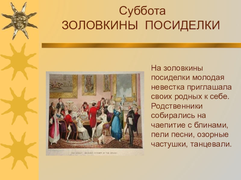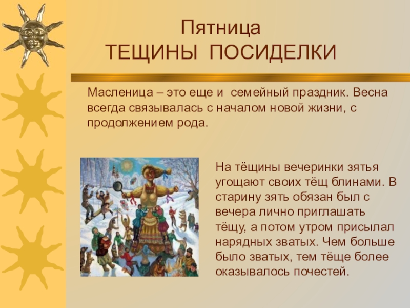 На тёщины вечеринки зятья угощают своих тёщ блинами. В старину зять обязан был с вечера лично приглашать тёщу, а потом утром присылал нарядных зватых. Чем больше было зватых, тем тёще более оказывалось почестей.