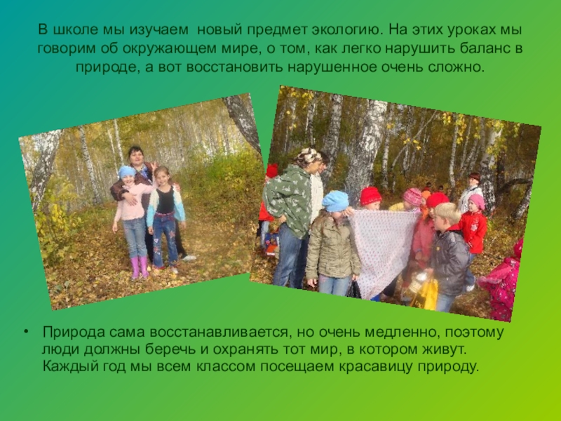 Природа сама восстанавливается, но очень медленно, поэтому люди должны беречь и охранять тот мир, в котором живут. Каждый год мы всем классом посещаем красавицу природу.