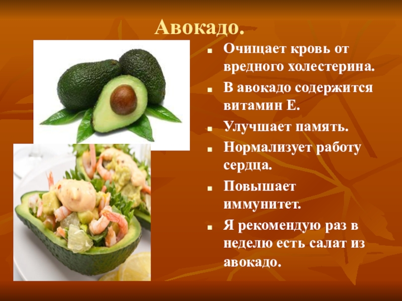Авокадо.Очищает кровь от вредного холестерина.В авокадо содержится витамин E.Улучшает память.Нормализует работу сердца. Повышает иммунитет.Я рекомендую раз в неделю