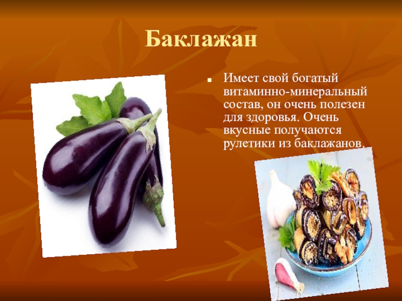 Баклажан Имеет свой богатый витаминно-минеральный состав, он очень полезен для здоровья. Очень вкусные получаются рулетики из баклажанов.
