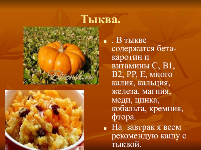 . В тыкве содержатся бета-каротин и витамины С, В1, В2, РР,