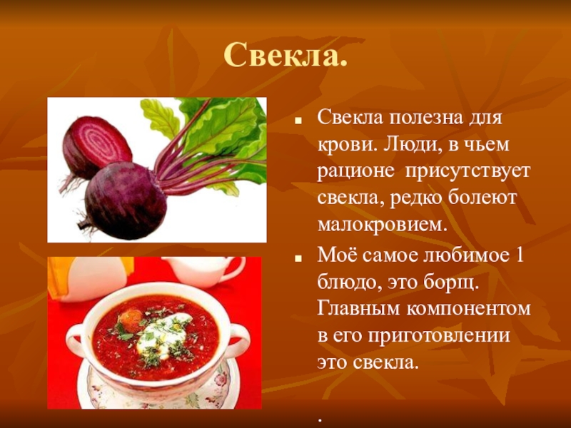 Свекла.Свекла полезна для крови. Люди, в чьем рационе  присутствует свекла, редко болеют малокровием.Моё самое любимое 1 блюдо, это