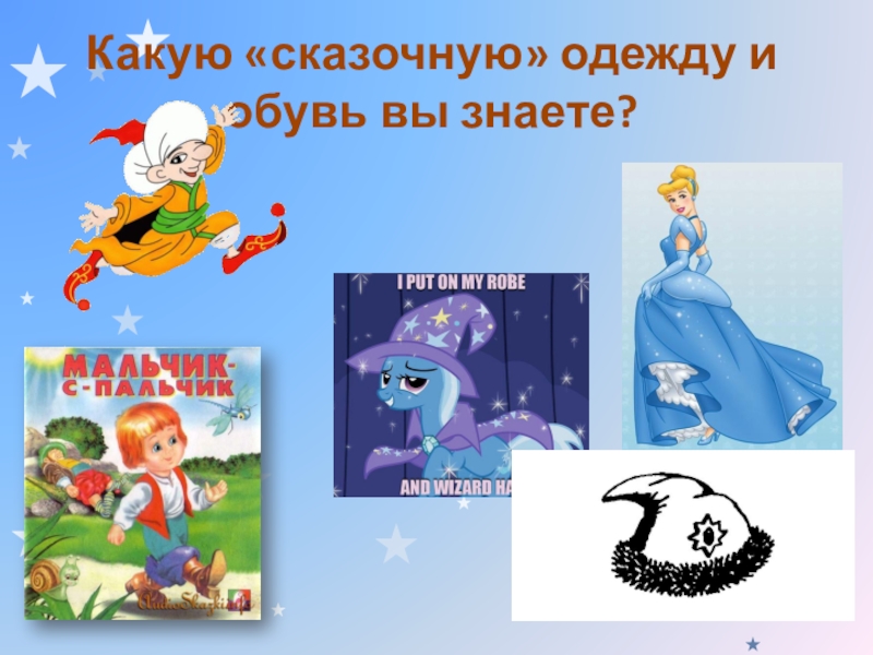 Слайд 7Какую «сказочную» одежду и обувь вы знаете?