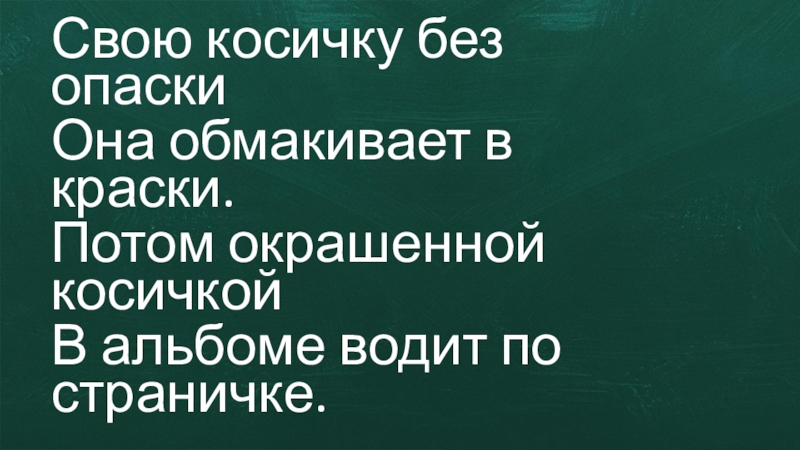 Свою косичку без опаскиОна обмакивает в краски.Потом окрашенной косичкойВ альбоме водит по страничке.