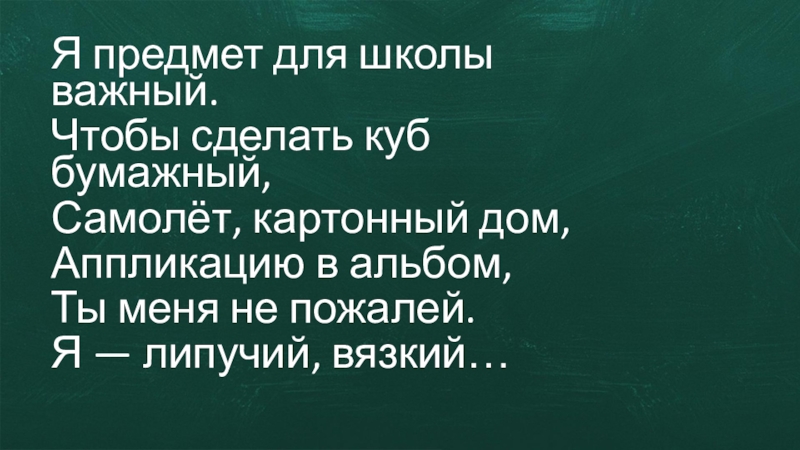 Я предмет для школы важный.Чтобы сделать куб бумажный,Самолёт, картонный дом,Аппликацию в альбом,Ты меня не пожалей.Я