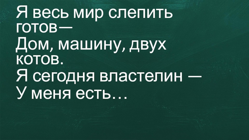 Я весь мир слепить готов—Дом, машину, двух котов.Я сегодня властелин —У меня есть…