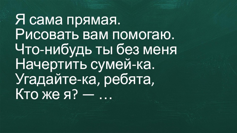 Я сама прямая.Рисовать вам помогаю.Что-нибудь ты без меняНачертить сумей-ка.Угадайте-ка, ребята,Кто же я? — …