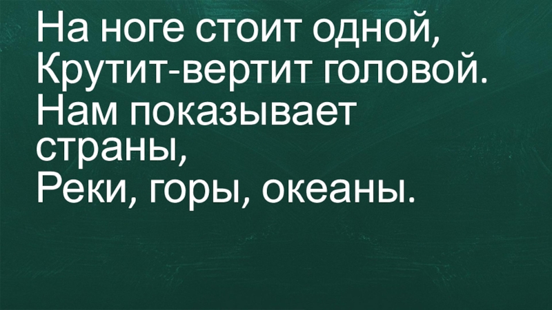 На ноге стоит одной,Крутит-вертит головой.Нам показывает страны,Реки, горы, океаны.