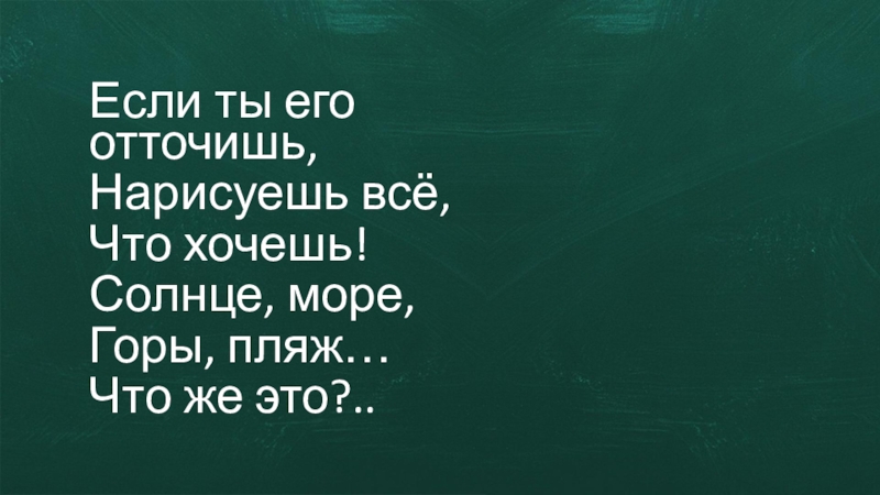 Если ты его отточишь,Нарисуешь всё,Что хочешь!Солнце, море,Горы, пляж…Что же это?..Солнце, море,Горы, пляж…Что же это?..