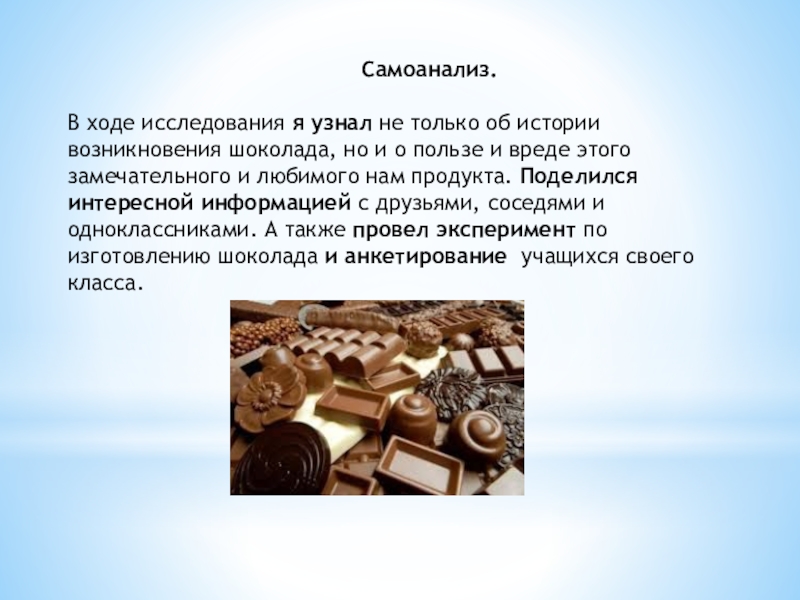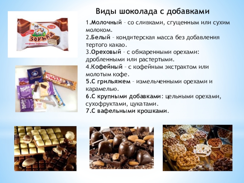 4.Шоколад с начинкой – ореховой, кремовой, фруктово-мармеладной, желейной, помадной, сливочной и др. Доля начинки не должна превышать 50% от общей массы продукта.