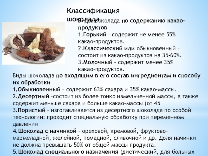Виды шоколада по входящим в его состав ингредиентам и способу их обработки