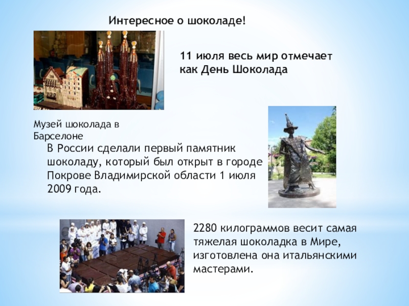 В России сделали первый памятник шоколаду, который был открыт в городе Покрове Владимирской области 1 июля 2009 года.
