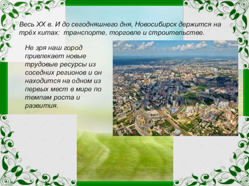 Весь ХХ в. И до сегодняшнего дня, Новосибирск держится на трёх китах: транспорте, торговле и строительстве.
