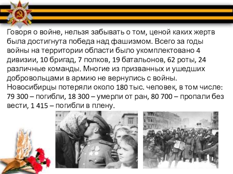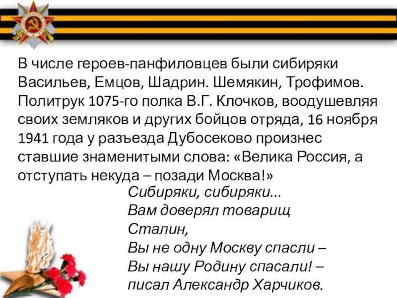 В битвах и сражениях Великой Отечественной войны особое место занимают сибиряки. Сибирские дивизии и полки сражались на всех участках фронта, участвовали в Московской, Сталинградской, Курской и других важнейших операциях.