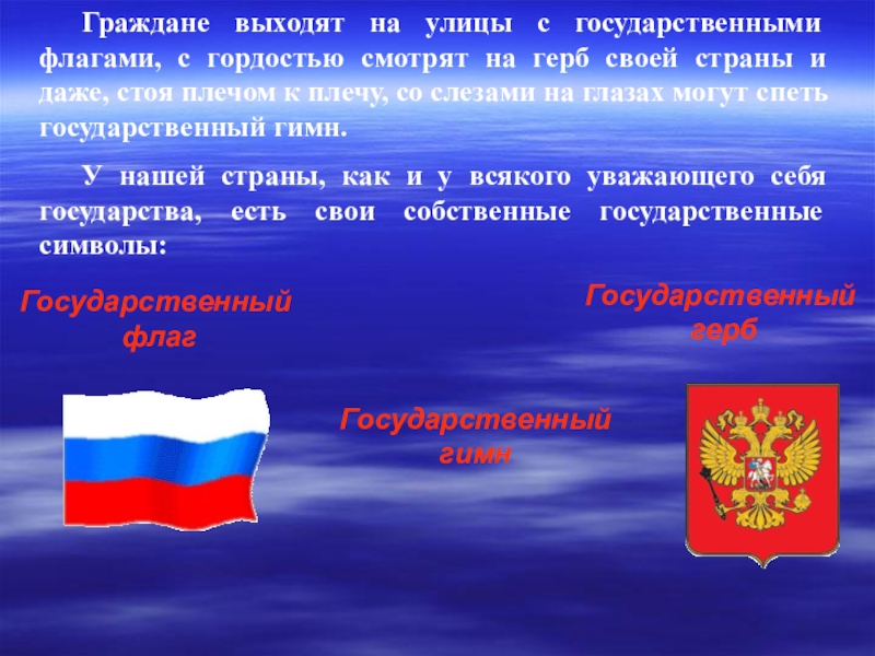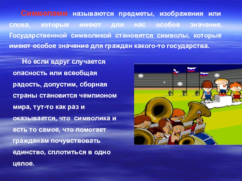 Но если вдруг случается опасность или всеобщая радость, допустим, сборная страны становится чемпионом мира, тут-то как раз и оказывается, что символика и есть то самое, что помогает гражданам почувствовать единство, сплотиться в одно целое.