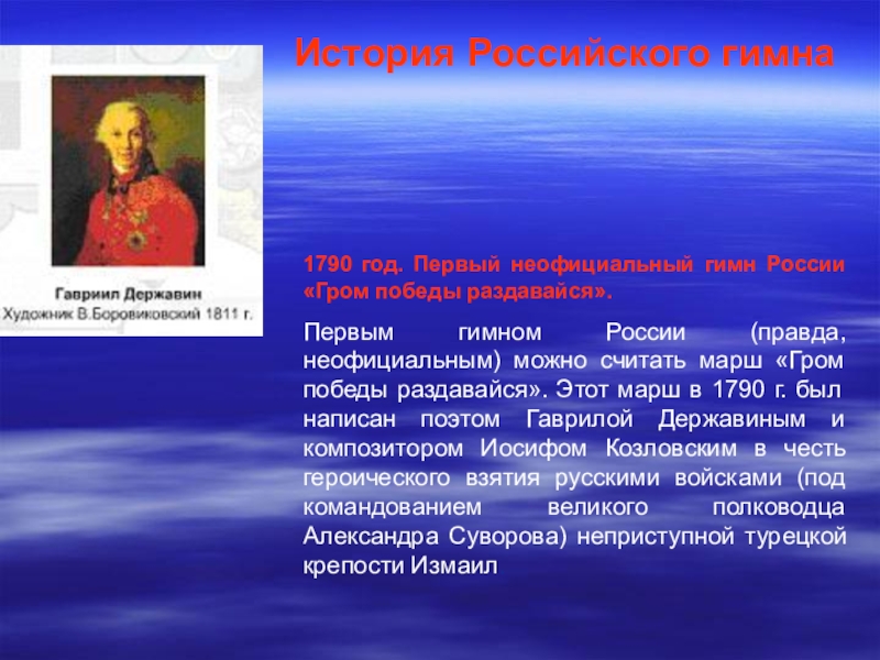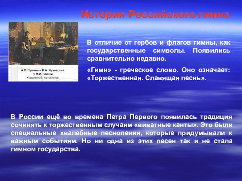В России ещё во времена Петра Первого появилась традиция сочинять к торжественным случаям «виватные канты». Это были специальные хвалебные песнопения, которые придумывали к важным событиям. Но ни одна из этих песен так и не стала гимном государства.
