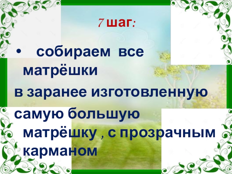 7 шаг:  собираем все матрёшки в заранее изготовленную самую большую матрёшку , с прозрачным карманом