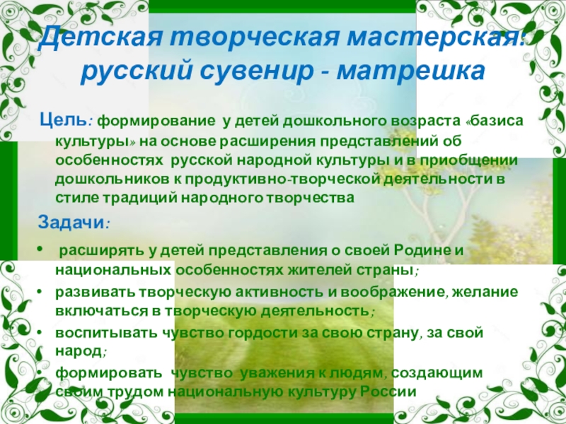 Детская творческая мастерская: русский сувенир - матрешка Цель: формирование у детей дошкольного возраста «базиса культуры» на основе