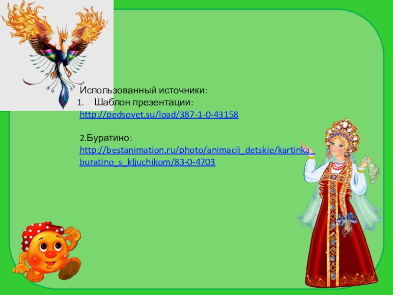 Использованный источники:Шаблон презентации:http://pedsovet.su/load/387-1-0-431582.Буратино: http://bestanimation.ru/photo/animacii_detskie/kartinka_buratino_s_kljuchikom/83-0-4703