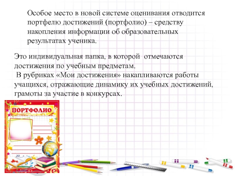Слайд 31Особое место в новой системе оценивания отводится портфелю достижений (портфолио) –