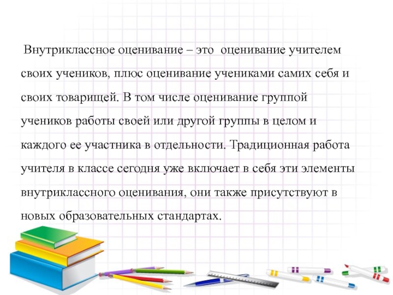 Слайд 5 Внутриклассное оценивание – это оценивание учителем своих учеников, плюс оценивание