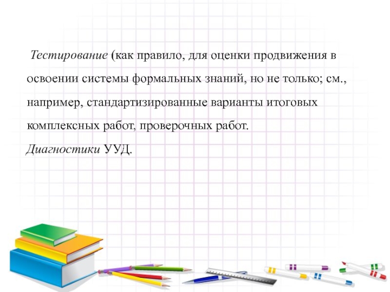 Слайд 17 Тестирование (как правило, для оценки продвижения в освоении системы формальных