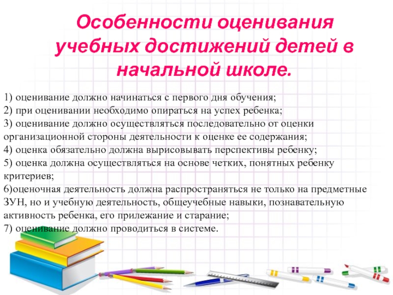 6)оценочная деятельность должна распространяться не только на предметные ЗУН, но и учебную деятельность, общеучебные навыки, познавательную активность ребенка, его прилежание и старание;