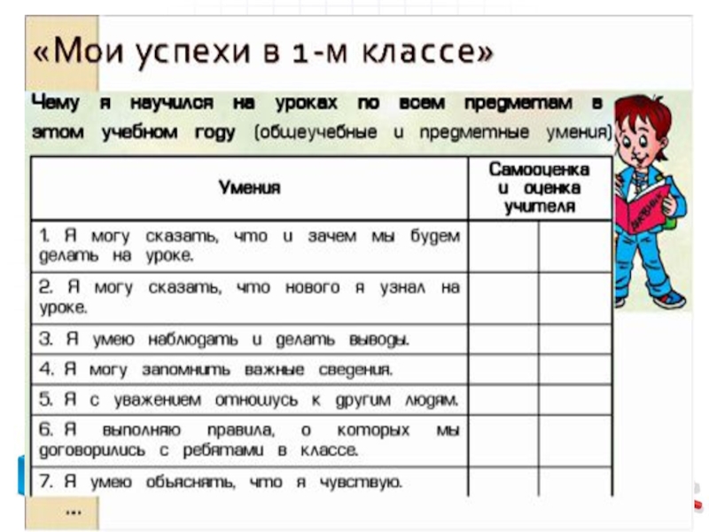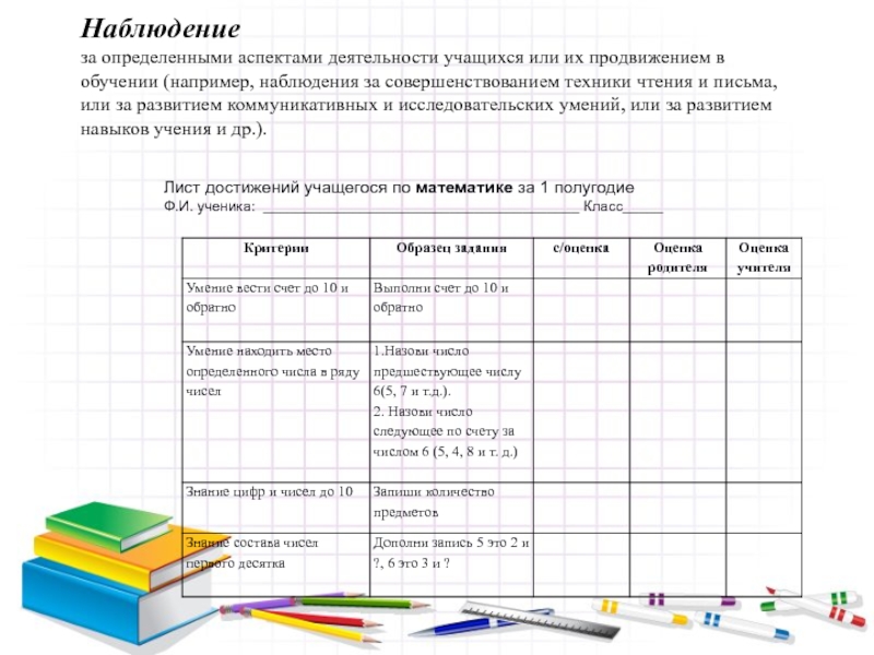 (например, наблюдения за совершенствованием техники чтения и письма, или за развитием коммуникативных и исследовательских умений, или за развитием навыков учения и др.).