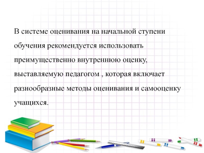 Слайд 9В системе оценивания на начальной ступени обучения рекомендуется использовать преимущественно внутреннюю