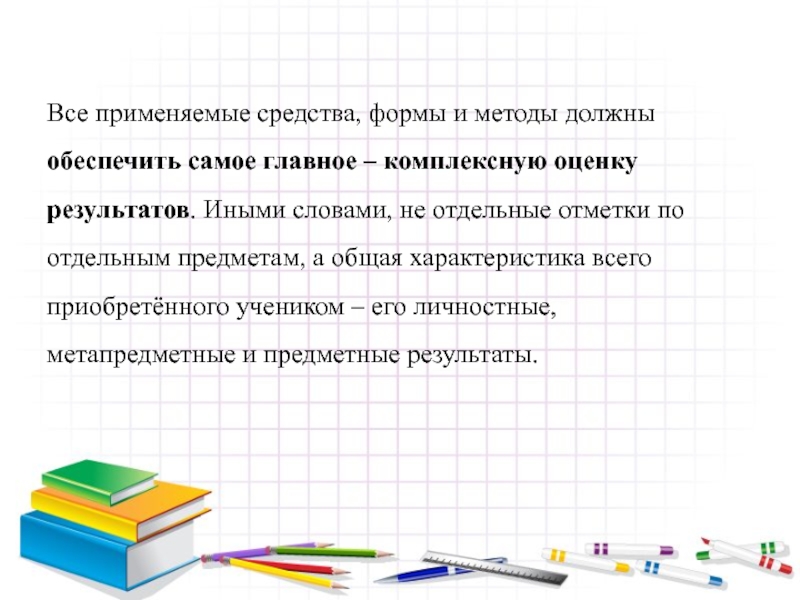 комплексную оценку результатов. Иными словами, не отдельные отметки по отдельным предметам, а общая характеристика всего приобретённого учеником – его личностные, метапредметные и предметные результаты.