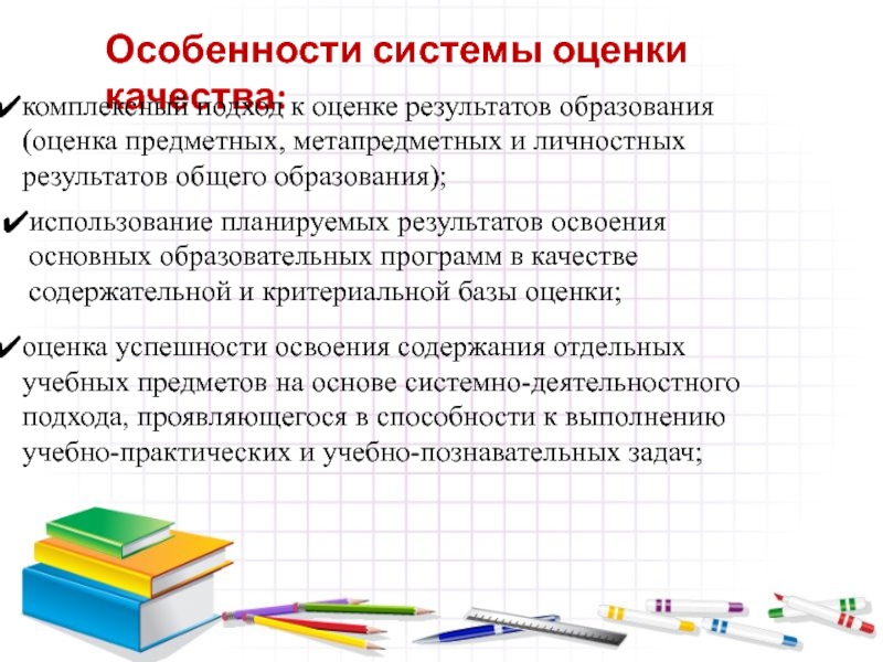 Слайд 3Особенности системы оценки качества: