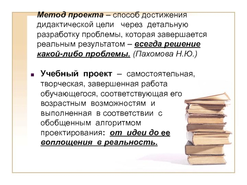 Учебный проект – самостоятельная, творческая, завершенная работа обучающегося, соответствующая его возрастным возможностям и выполненная в соответствии с обобщенным алгоритмом проектирования: от идеи до ее воплощения в реальность.