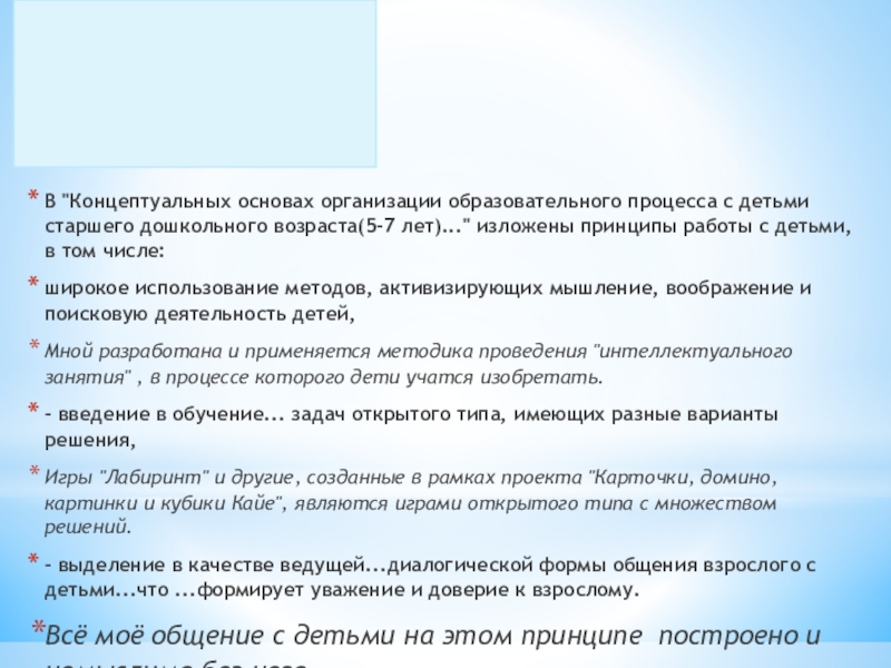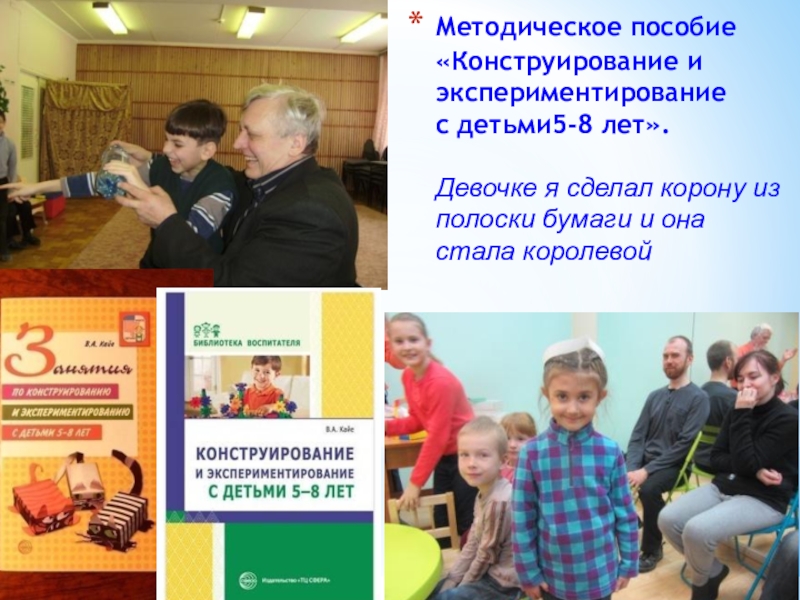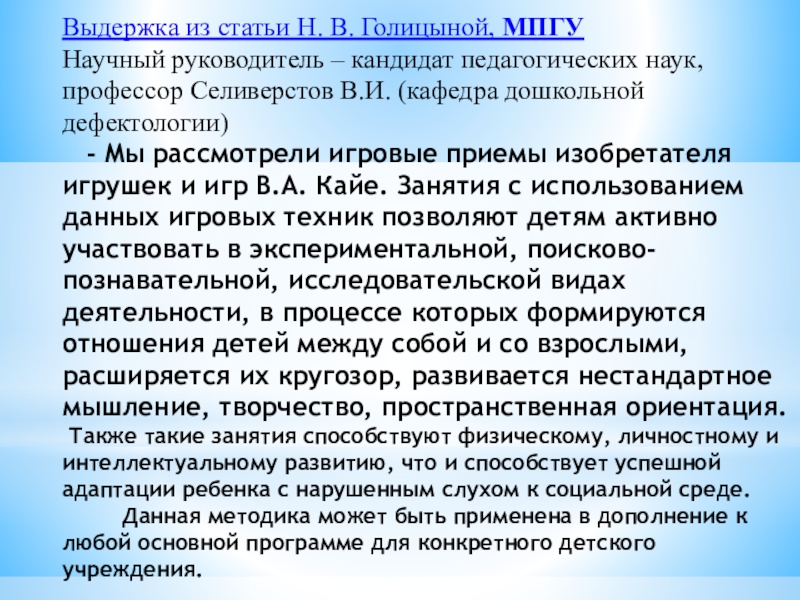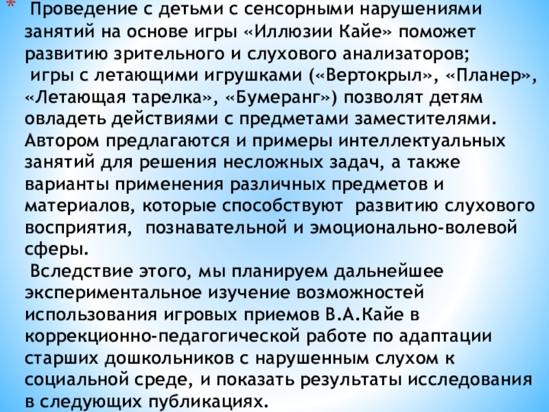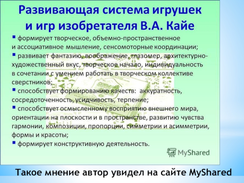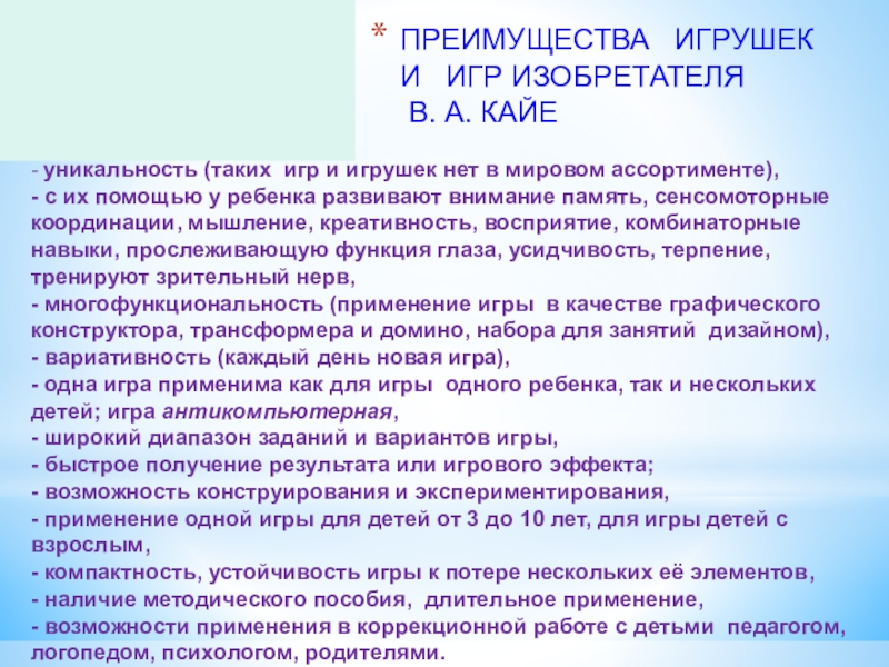 - Мы рассмотрели игровые приемы изобретателя игрушек и игр В.А. Кайе. Занятия с использованием данных игровых техник позволяют детям активно участвовать в экспериментальной, поисково-познавательной, исследовательской видах деятельности, в процессе которых формируются отношения детей между собой и со взрослыми, расширяется их кругозор, развивается нестандартное мышление, творчество, пространственная ориентация.