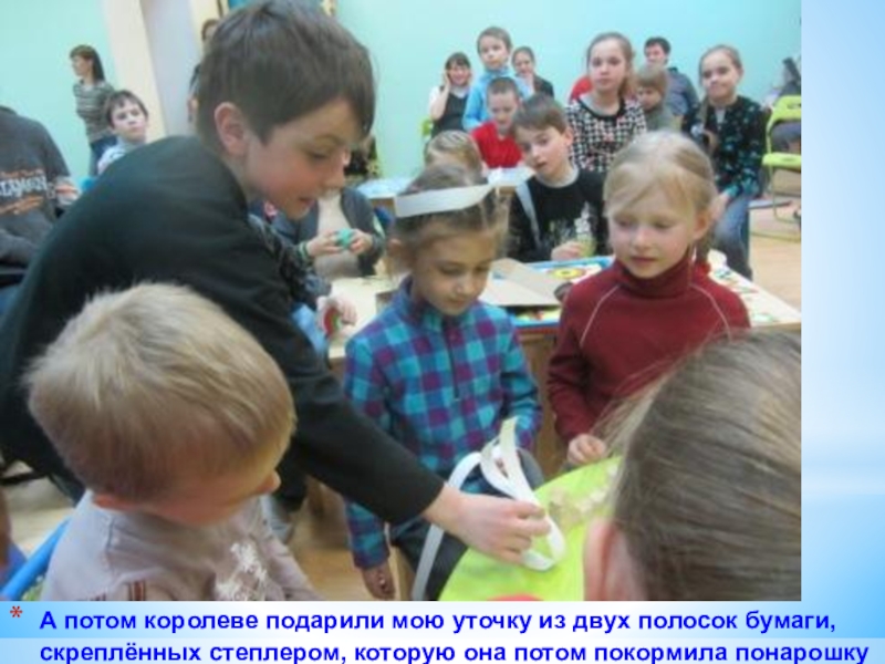 Слайд 53А потом королеве подарили мою уточку из двух полосок бумаги, скреплённых