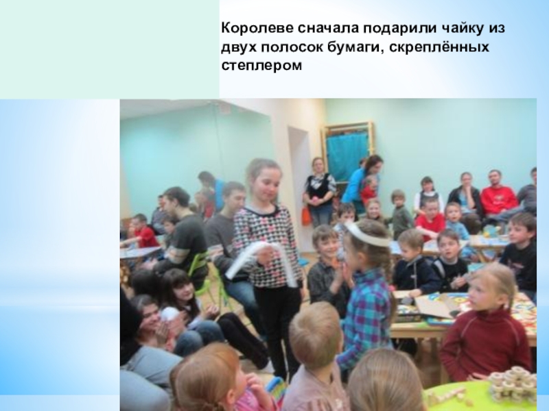 Слайд 52Королеве сначала подарили чайку из двух полосок бумаги, скреплённых степлером