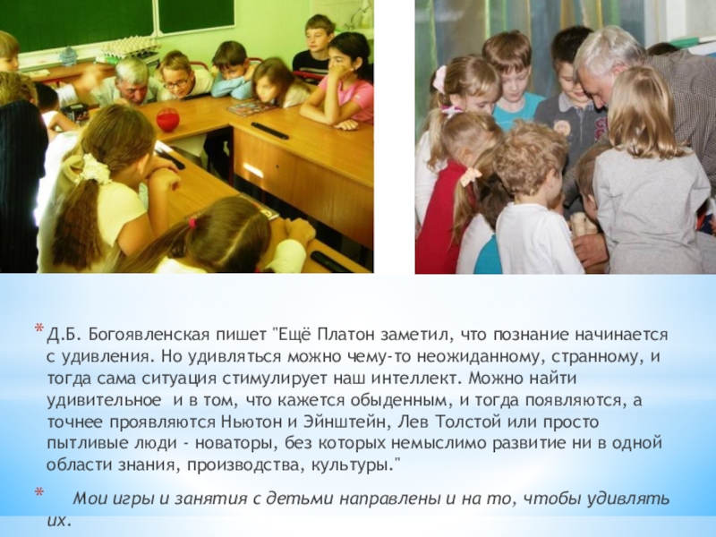 «- Экспериментирование ребёнка с исследовательской игрой - это деятельность, где исследование, интеллект и творчество теснейшим образом взаимодействуют и результаты познания определяются гармоничностью этого взаимодействия.