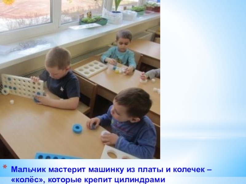 Слайд 62Мальчик мастерит машинку из платы и колечек – «колёс», которые крепит