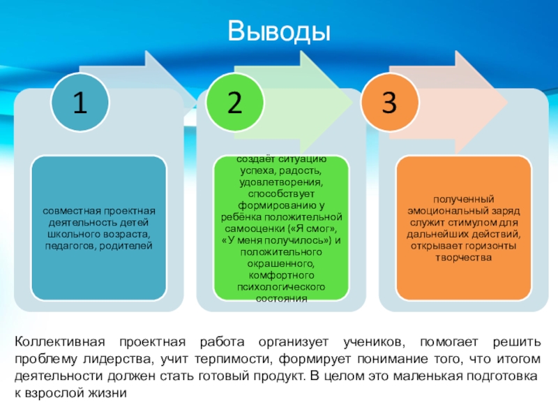 ВыводыКоллективная проектная работа организует учеников, помогает решить проблему лидерства, учит терпимости, формирует понимание того, что итогом деятельности