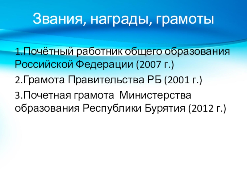 Звания, награды, грамоты 1.Почётный работник общего образования Российской Федерации (2007 г.)2.Грамота Правительства РБ (2001 г.)3.Почетная грамота Министерства