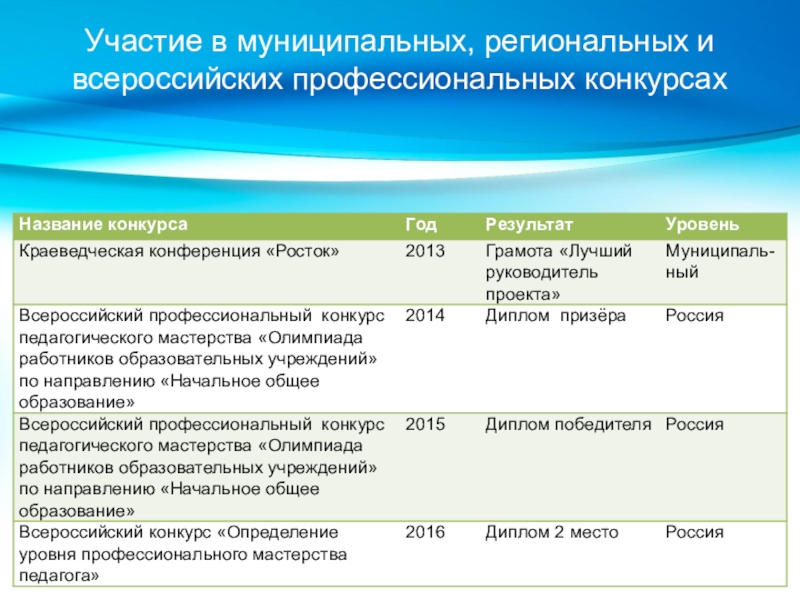 Слайд 13Участие в муниципальных, региональных и всероссийских профессиональных конкурсах