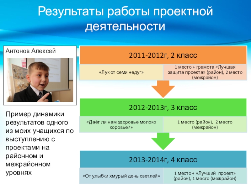 Результаты работы проектной деятельностиПример динамики результатов одного из моих учащихся по выступлению с проектами на районном и