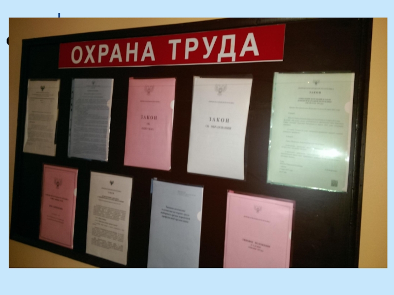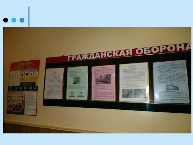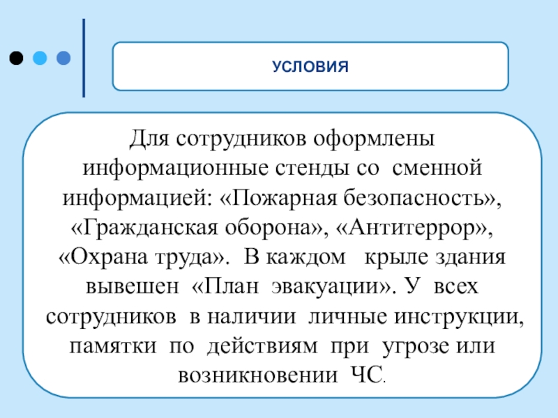 оборона», «Антитеррор», «Охрана труда». В каждом крыле здания вывешен «План эвакуации». У всех сотрудников в наличии личные инструкции, памятки по действиям при угрозе или возникновении ЧС.