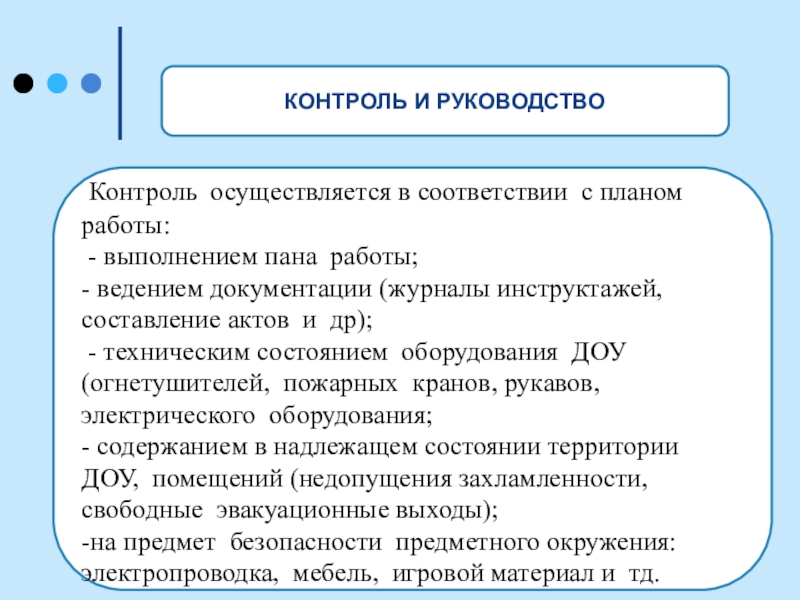 - техническим состоянием оборудования ДОУ (огнетушителей, пожарных кранов, рукавов, электрического оборудования;