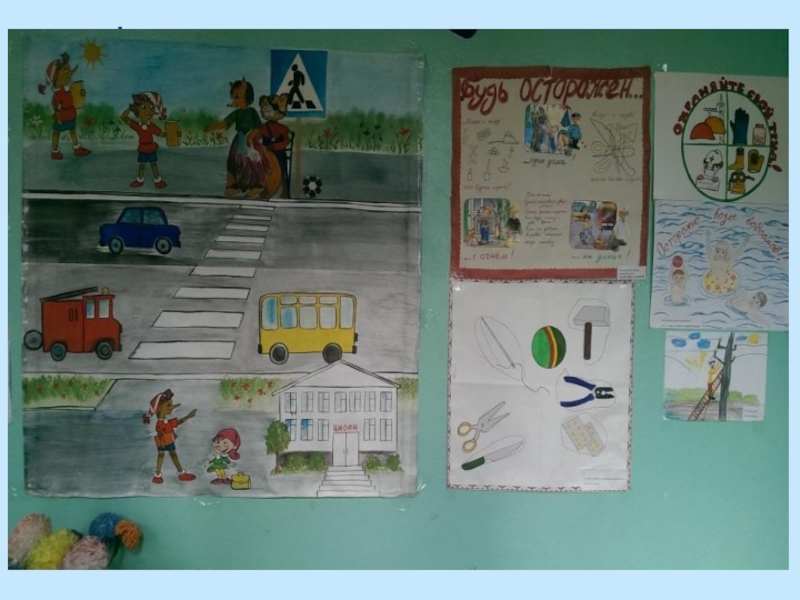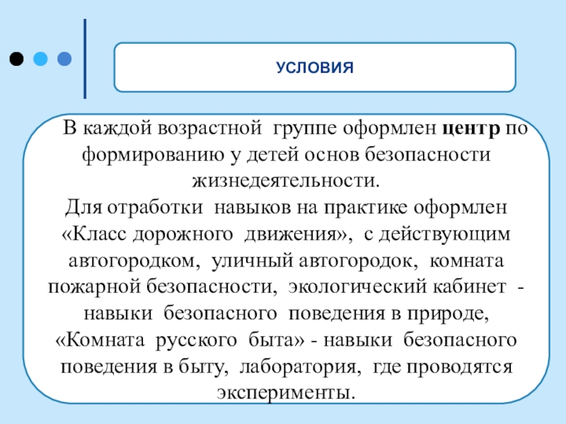 Для отработки навыков на практике оформлен «Класс дорожного движения», с действующим автогородком, уличный автогородок, комната пожарной безопасности, экологический кабинет - навыки безопасного поведения в природе, «Комната русского быта» - навыки безопасного поведения в быту, лаборатория, где проводятся эксперименты.