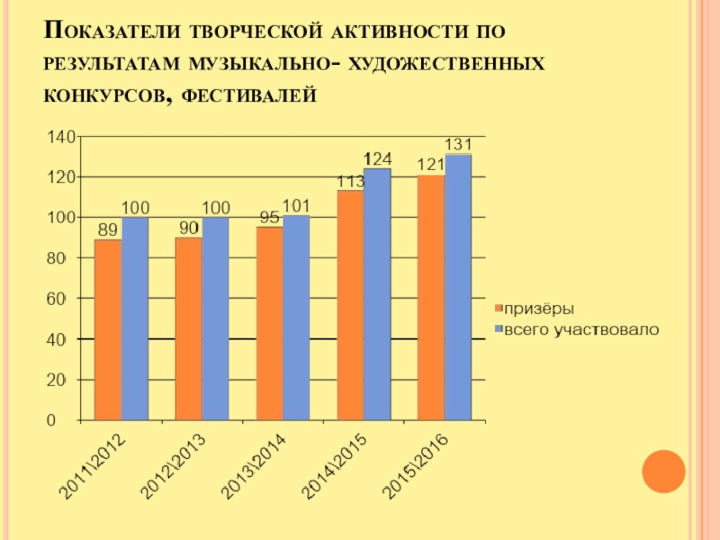 Слайд 14Показатели творческой активности по результатам музыкально- художественных конкурсов, фестивалей