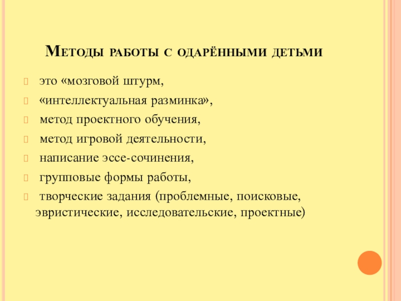Методы работы с одарёнными детьми это «мозговой штурм, «интеллектуальная разминка», метод проектного обучения, метод игровой деятельности, написание