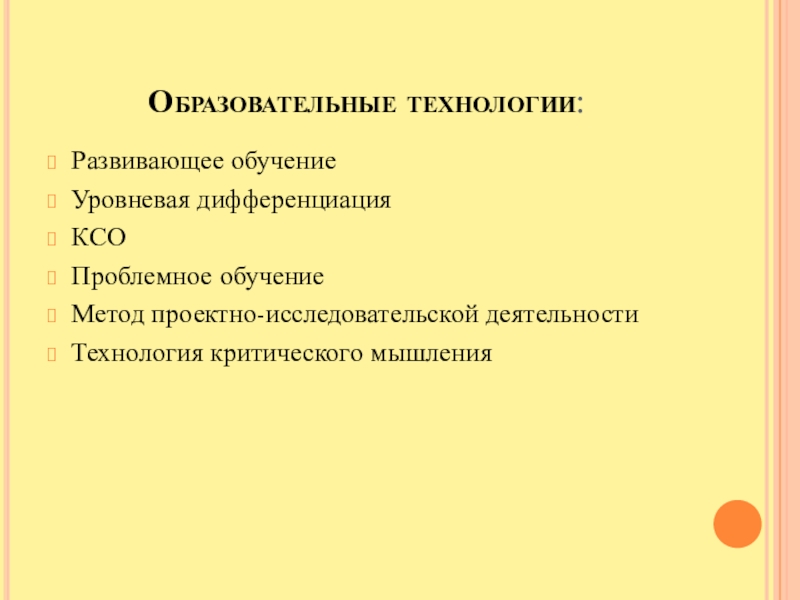 Образовательные технологии:Развивающее обучениеУровневая дифференциацияКСОПроблемное обучениеМетод проектно-исследовательской деятельностиТехнология критического мышления