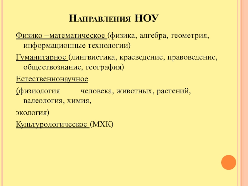 Направления НОУ Физико –математическое (физика, алгебра, геометрия, информационные технологии)Гуманитарное (лингвистика, краеведение, правоведение, обществознание, география)Естественнонаучное (физиология